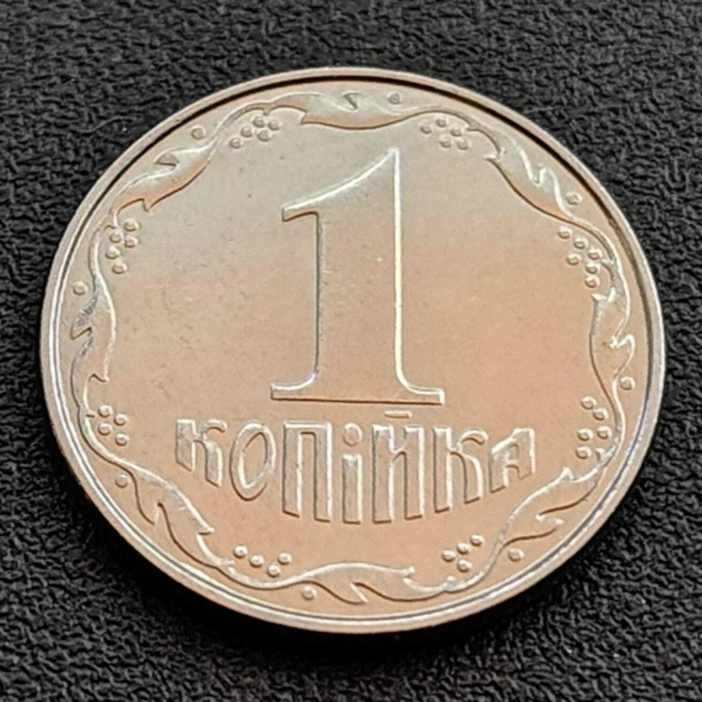 Valor facial “1 КОПІЙОК” em destaque, cercado por ornamentos vegetais 🌿.