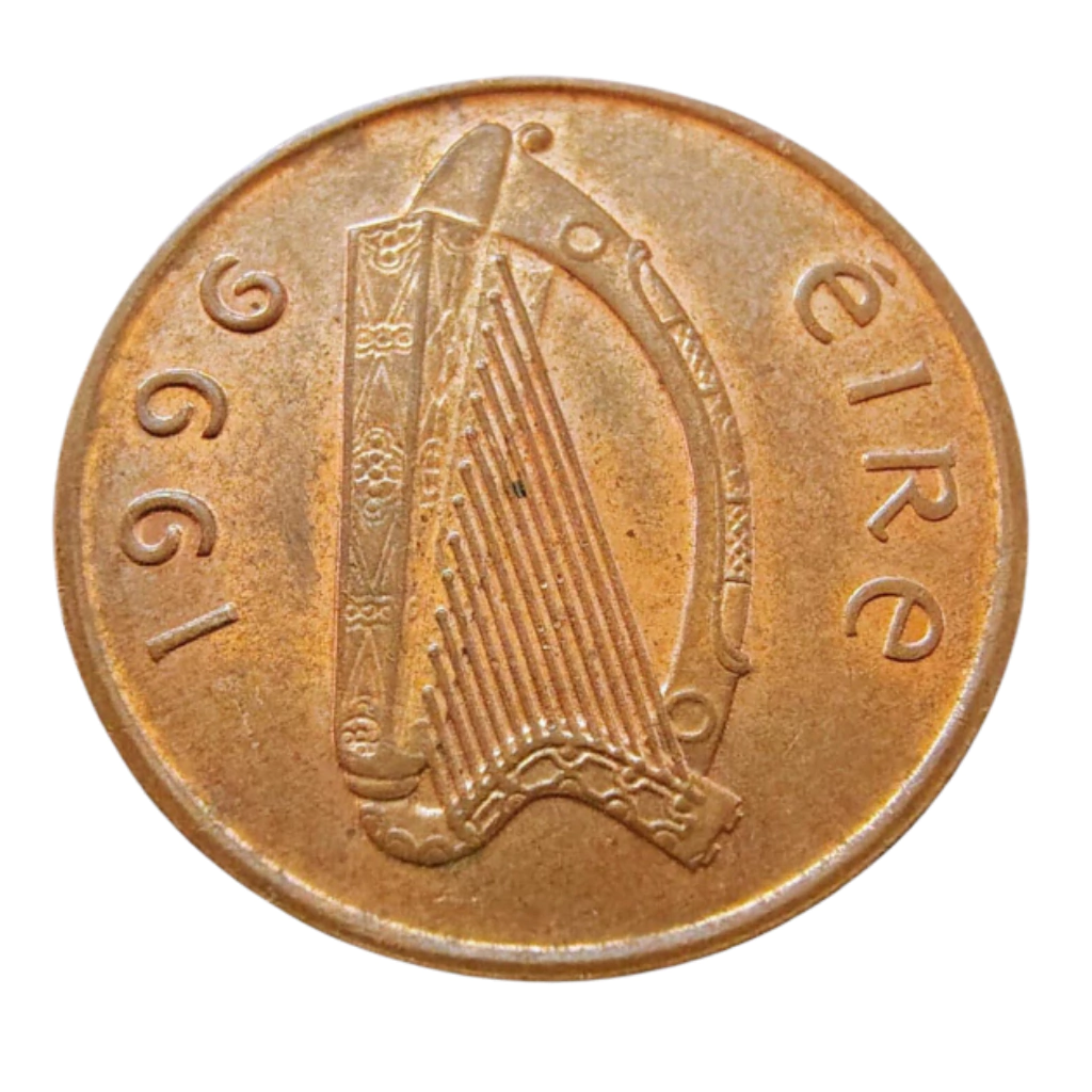Esta charmosa moeda de 1 penny irlandês, cunhada em 1996, representa a tradição celta e a identidade cultural da Irlanda pré-euro. No anverso, vemos a famosa harpa celta, símbolo nacional da Irlanda, acompanhada da inscrição ÉIRE.