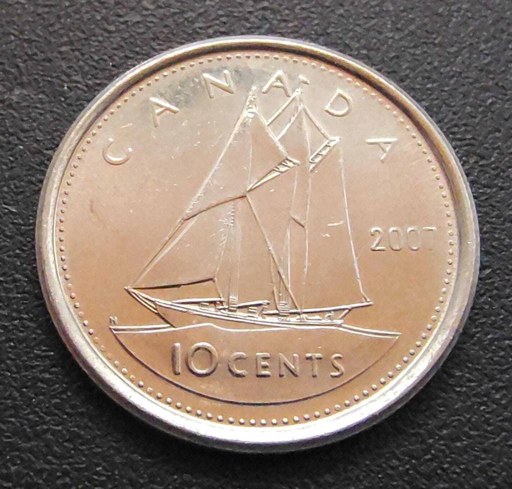 ✨ Esta edição de 2007 reforça a tradição da moeda de 10 cêntimos canadense: no anverso, a imagem renovada da Rainha Isabel II; no reverso, o eterno símbolo do mar canadense, o lendário Bluenose.