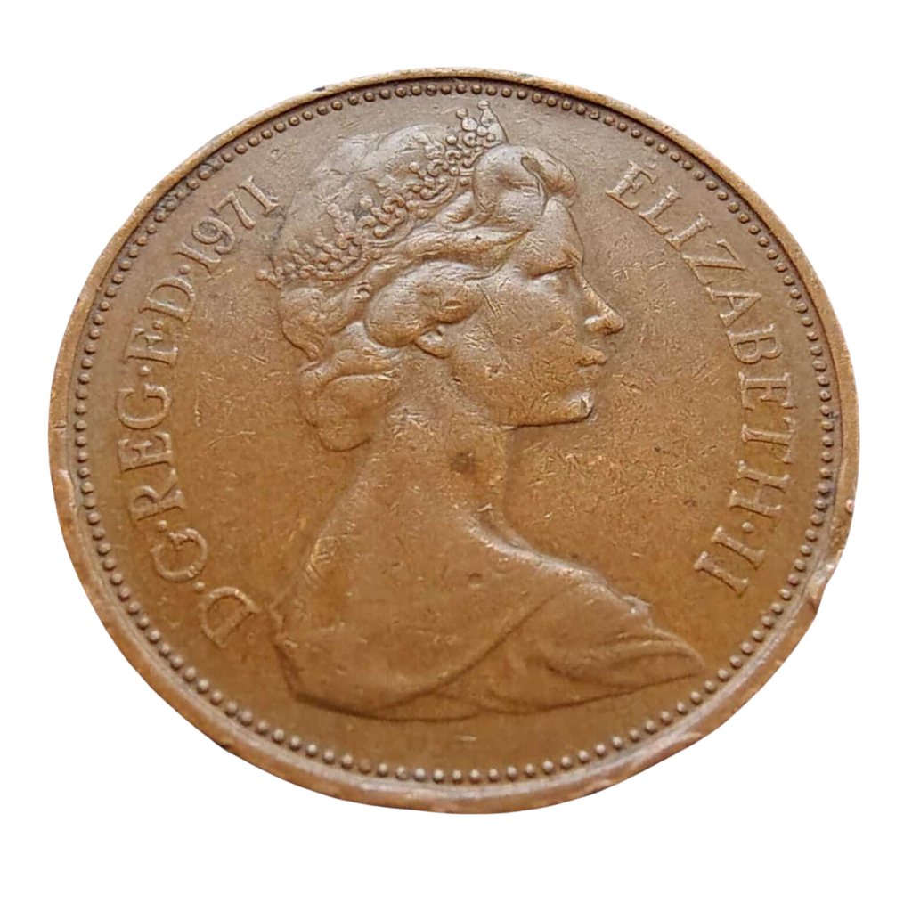 2 new pence 1971, moeda Reino Unido bronze, moedas Isabel II, moedas britânicas antigas, moedas decimalização UK, moedas colecionáveis Reino Unido, moedas britânicas história, numismática Reino Unido século XX.