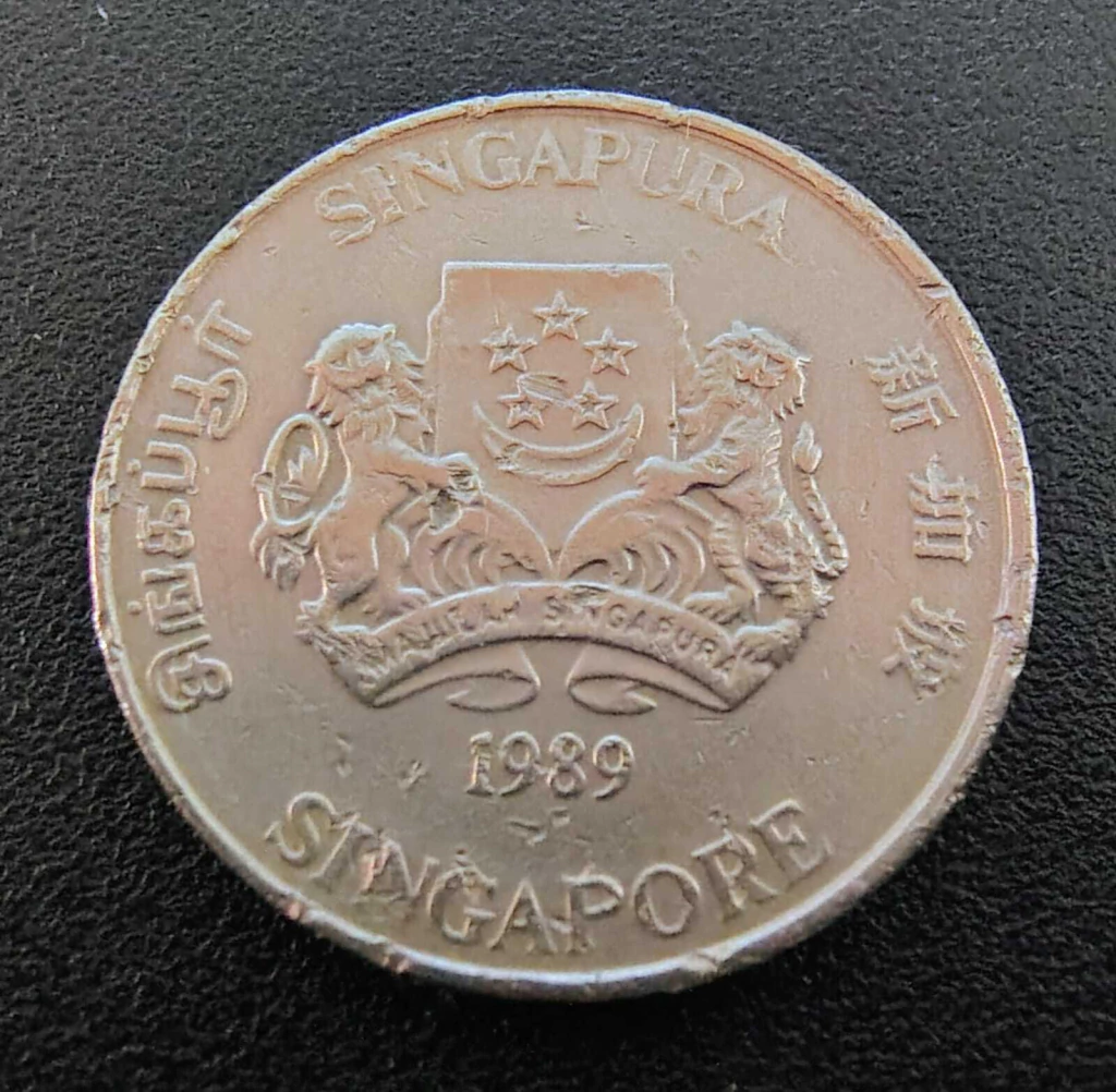 Feita em cupro-níquel, apresenta no anverso o brasão de Singapura com leão e tigre, e a inscrição do país em quatro línguas oficiais (tâmil, malaio, inglês e chinês). No reverso, um delicado desenho da flor jasmim, típica da região.