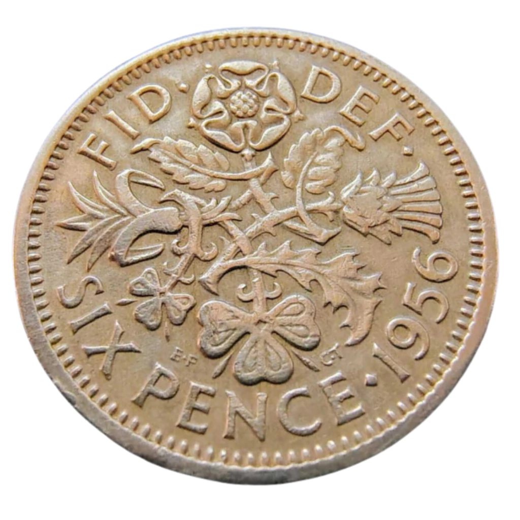 Emitida em 1956, esta moeda de 6 pence pertence ao sistema pré-decimal britânico, circulando sob o reinado da Rainha Isabel II. Cunhada em cupro-níquel, tem formato redondo, bordo serrilhado, peso de 2,83g, diâmetro de 19,3mm e espessura de 1,2mm.