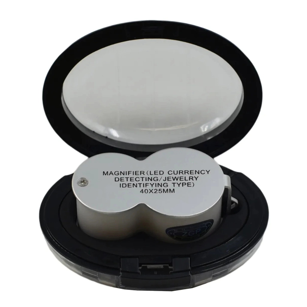 O corpo em alumínio e ABS garante leveza e durabilidade, e o design dobrável permite transporte fácil no bolso ou no estojo acrílico anatômico, que ainda inclui chave para troca das baterias. Um instrumento portátil, elegante e extremamente funcional para o colecionismo em geral, podendo identificar os mínimos detalhes de cada peça.