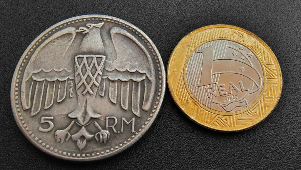 Medalha cópia 5 Reichsmark, inspirada no período da Alemanha pré-Segunda Guerra Mundial, sem valor legal de curso, produzida apenas para colecionismo.