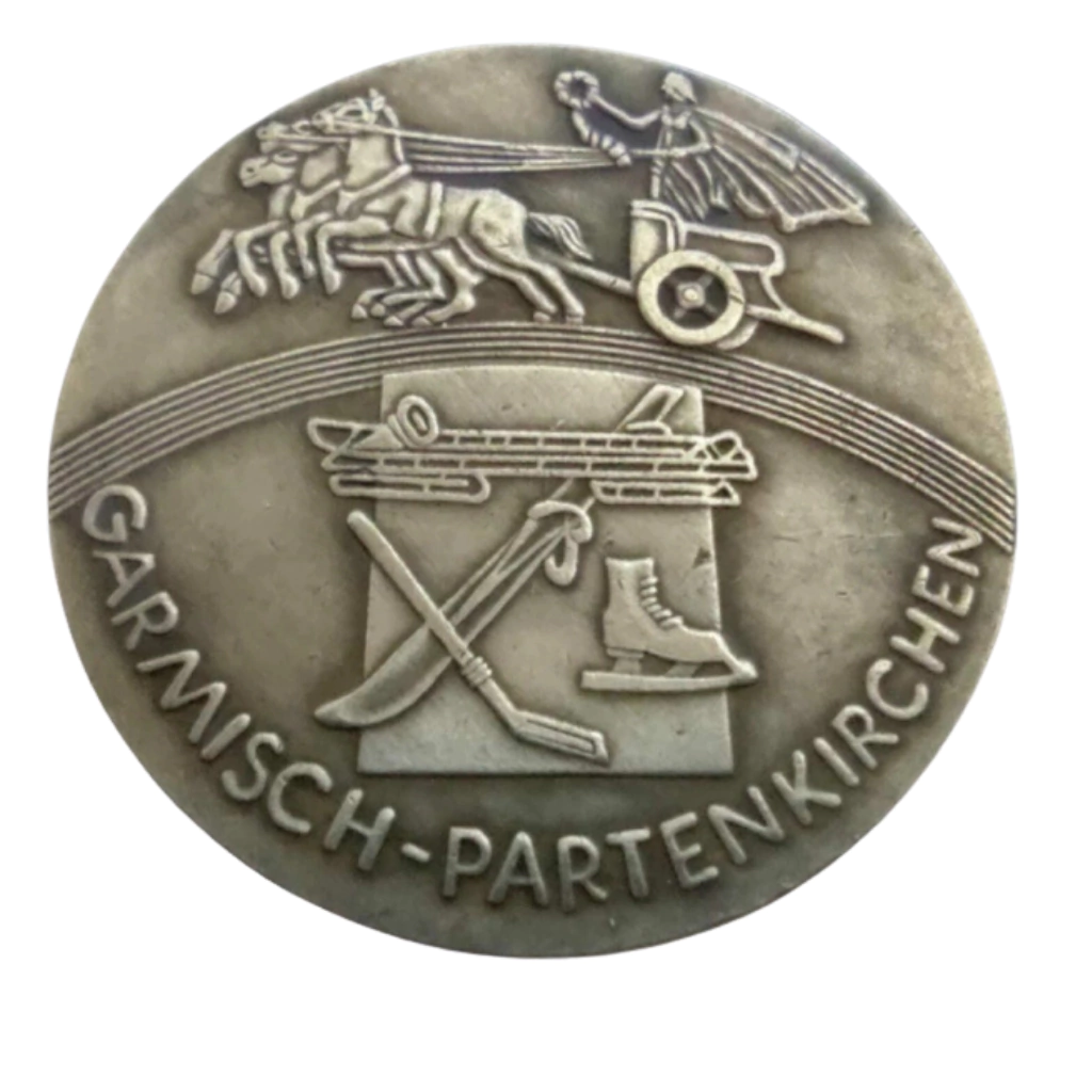 Características: - Design Elegante: A medalha apresenta um carro de corrida antigo ao lado da Deusa da Vitória, simbolizando velocidade e triunfo. - Elementos Esportivos: Na parte inferior, você pode observar os equipamentos utilizados nas competições, como bobsleigh, esquis, patins de gelo e tacos de hóquei no gelo. - Inscrições Comemorativas: Inclui os anéis olímpicos e a inscrição "IV. Jogos Olímpicos de Inverno de 1936", além de "Garmisch-Partenkirchen".
